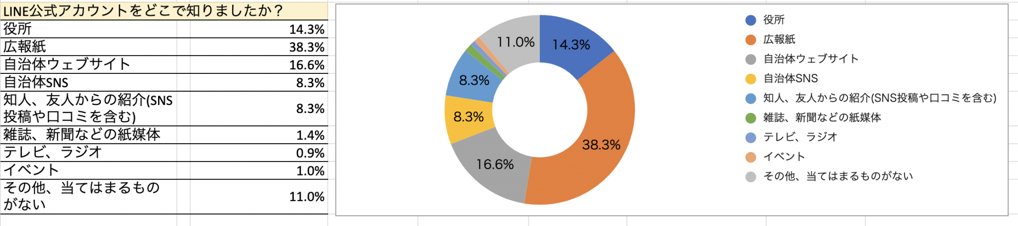 自治体の公式LINEを知ったきかっけとして、「広報紙」が38%、「役所」が24%、「自治体ウェブサイト」が16%となり、自治体で管理している場所で8割弱を占める。次いで、「自治体SNS」が8%、「知人、友人からの紹介」が8%となり、口コミメディアで2割弱となっていることから、若年層へのリーチにSNSの活用は引き続き重要になるといえる。
