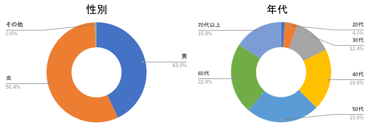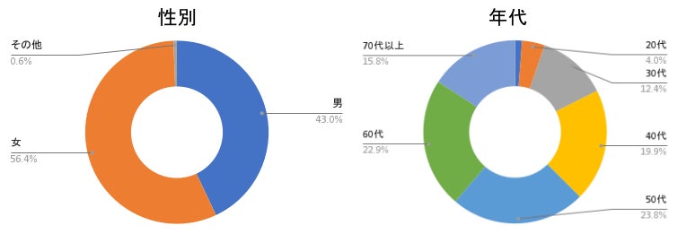 女性が56%,男性が43%となり、女性の回答者が多い傾向となった。年代では、「60代」が23%、「50代」が24%、「40代」が20%、「70代以上」が16%となり、40代以上が全体で8割以上を占めた。要因としては、コロナウィルスワクチン接種の予約機能や関連情報に注目している年代が多いことや、自治体の役場や広報紙など自治体と接点が多いことがあげられる。