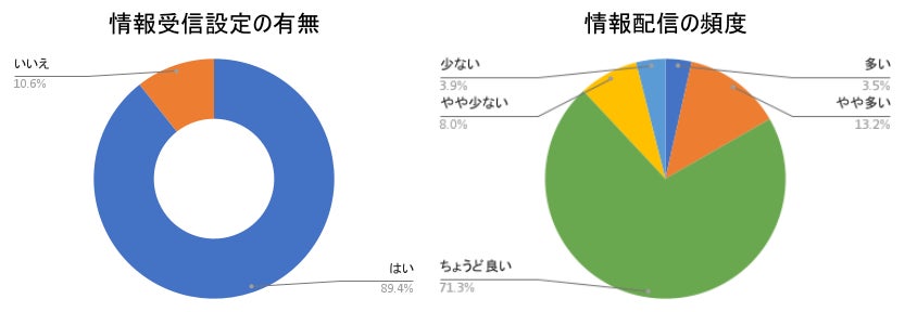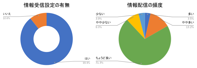 89%の回答者が、自治体からの情報受信設定をし、71%が情報発信の頻度を「ちょうど良い」と感じている。次いで、13%が「やや多い」と感じているが、情報提供の価値を上げていく方向性としては、情報の配信頻度を保ちながら、年代など利用者の属性に応じて情報を細分化して、きめ細やかなセグメント配信を行うことが考えられる。