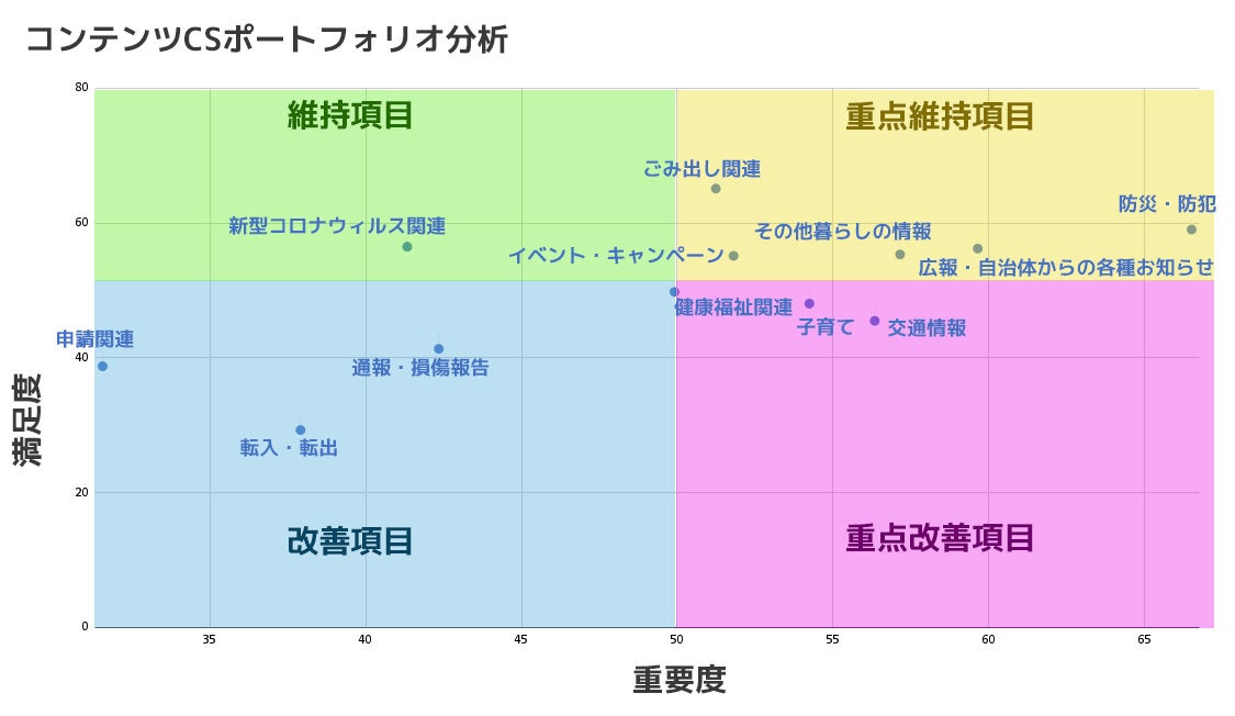 コンテンツの満足度と重要度でCSポートフィリオ分析をしたところ、重点維持項目に、「ごみ出し関連」「暮らしの情報」「広報・自治体からの各種お知らせ」「イベント・キャンペーン」「防災・防犯」が分布され満足度の高い結果となっている。