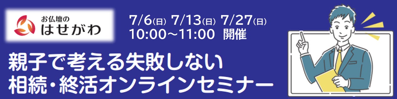仏壇・墓石の販売、屋内墓苑の受託販売、終活支援を手がける株式会社はせがわ(本社:福岡・東京、代表取締役社長:新貝 三四郎)は、2025年7月に全3回、「親子で考える 失敗しない相続・終活セミナー」をオンラインにて開催いたします。