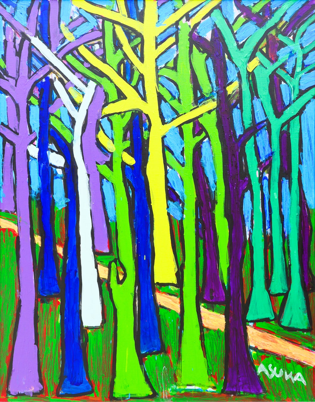 1981年埼玉県生まれ、陸前高田市在住。父の勧めで絵を描き始める。東日本大震災で被災し、家と200点に及ぶ作品を失った。身近な人々の死にも精神的なショックを受けてしばらく制作から遠のいていたが、変わっていく街の様子に向き合い制作を再開した。《森の道ー青い森》に見られる鮮やかな色使いについて、田﨑自身は「色は心が聞いている」と言う。宮沢賢治の『虔十公園林』の杉林のように、直立する樹々の深い緑の間を爽やかで涼やかな風が駆け抜けるようだ。