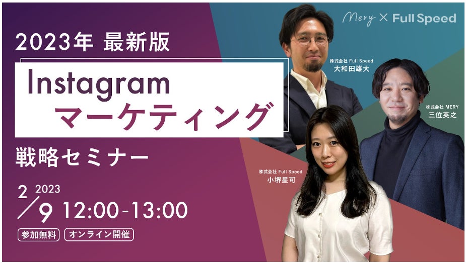 株式会社MERY(本社:東京都千代田区、代表取締役社長:藤田 欣司)は、株式会社フルスピード(本社:東京都渋谷区、代表取締役社長:友松 功一)とともに、SNSを活用したプロモーション施策を行う担当者向けのウェビナーを「2023年版 最新版Instagramマーケティング戦略」と題し開催することをお知らせします。