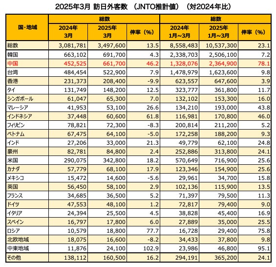 実際、2025年3月時点の訪日外国人数において、中国は前年同月比+46.2%という伸び率を記録し、訪日客数におけるシェアを急速に回復させています。