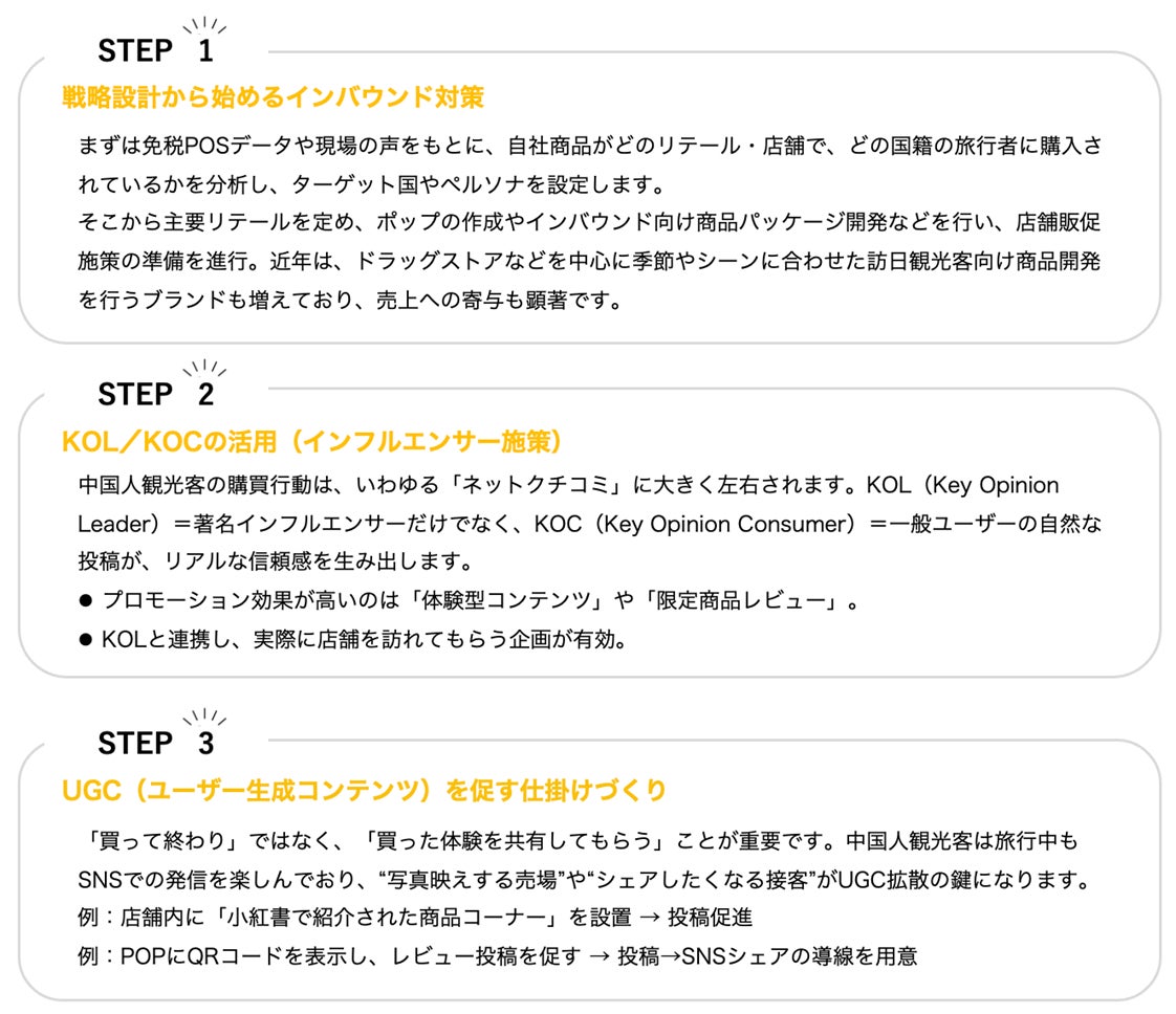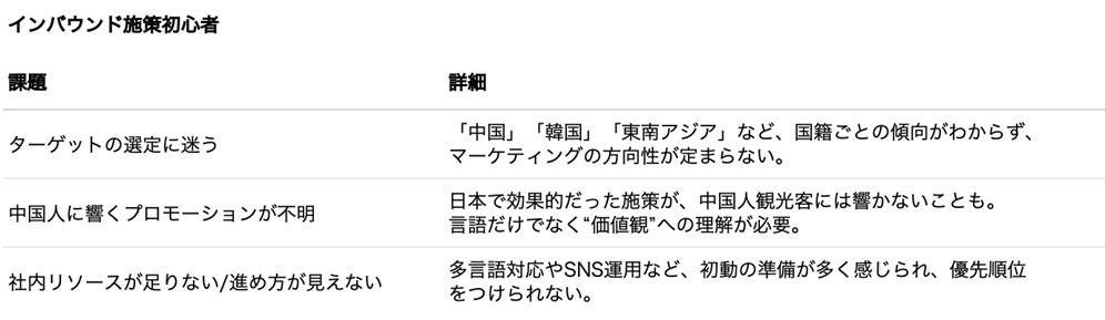 このような背景をふまえると、日本企業にとって中国人訪日客は“数が多い”だけでなく、“売上に直結しやすい層”であることが分かります。にもかかわらず、インバウンド未経験の企業からは「まず何から手をつけるべきか分からない」という声が多く聞かれます。