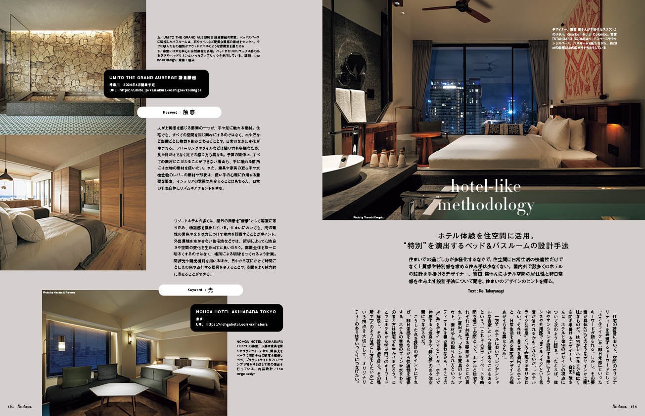 最新号では、「住まいづくり」と「旅と暮らし」を取り上げます。住まいをもつことが昔より難しい面もあるからこそ、より豊かな住まいにしたい。その参考となるのは、「住まいづくり“経験者”の声」や「最新版 住まいづくりのハウツー」。そして、理想の住まいをかなえるパートナーとなる、建築家やインテリアデザイナーを50組紹介。さらに、住まいの外での”良い体験”となる「旅」から得たデザインのヒントや、ホテルのベッド&バスルームの設計手法も解説。