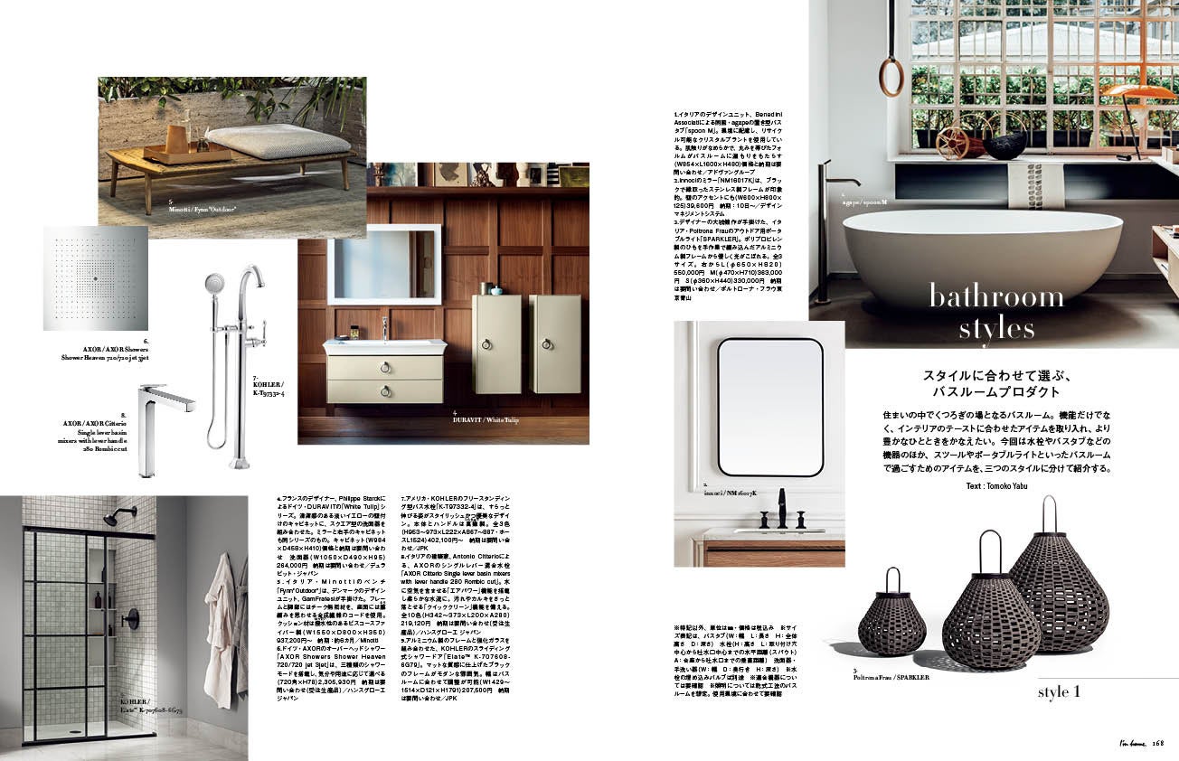 住まいの中でくつろぎの場となるバスルーム。機能だけでなく、インテリアのテーストに合わせたアイテムを取り入れ、より豊かなひとときをかなえたいもの。水栓やバスタブなどの機器のほか、スツールやポータブルライトといったバスルームで過ごすためのアイテムを、三つのスタイルに分けて紹介します。