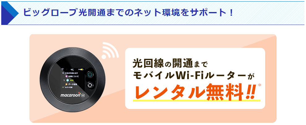 ビッグローブ光の開通工事が完了するまで、モバイルWi-Fiルーターを無料レンタルいたします。