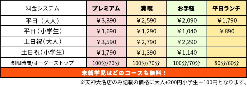 天神大名店では記載の料金とは異なる料金システムとなっております。(各コース大人+200円小学生+100円)