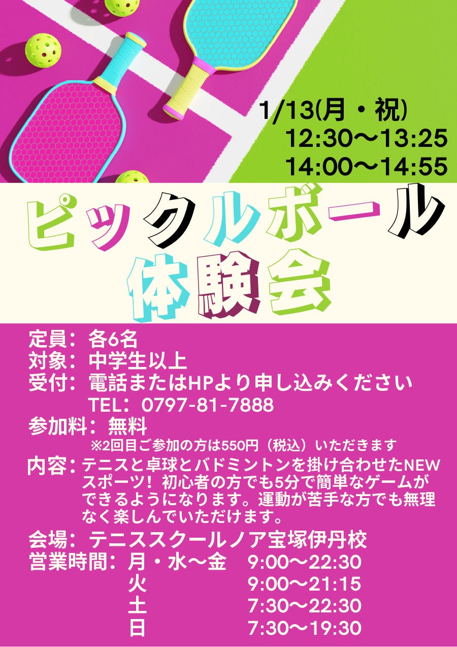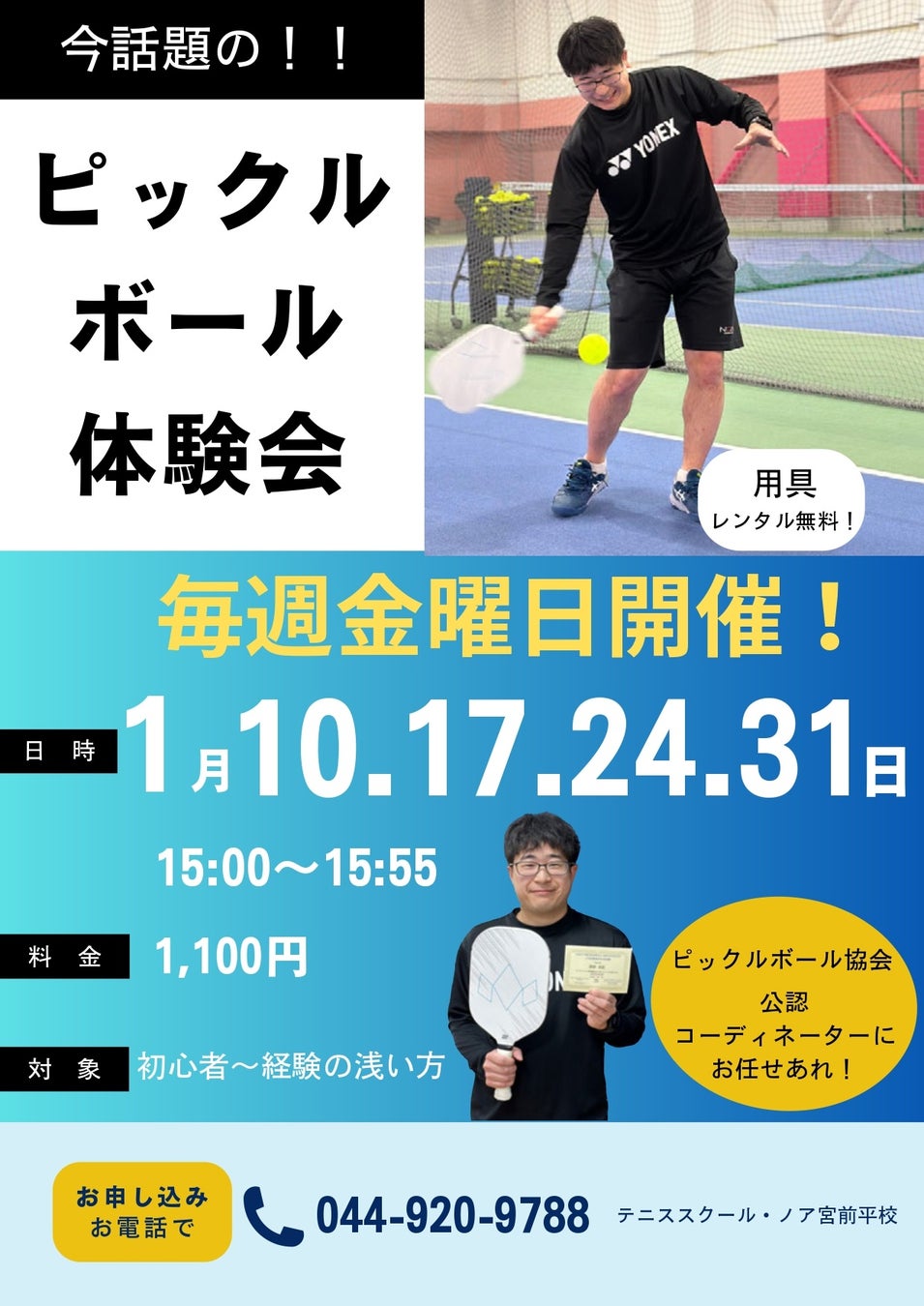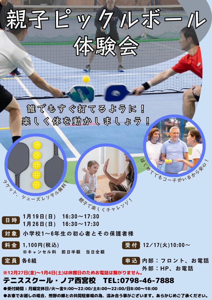 ノアインドアステージ株式会社が全国に35校展開しているテニススクール・ノアでは現在、神奈川県の横浜井土ヶ谷校、大阪府の大阪池田校でピックルボールクラスを開講しており、2025年1月には新たに兵庫県の尼崎塚口校でクラスを開講しました。本格的に全国展開へ向けて、初心者でも気軽に楽しめる体験イベントを各地で予定しております。