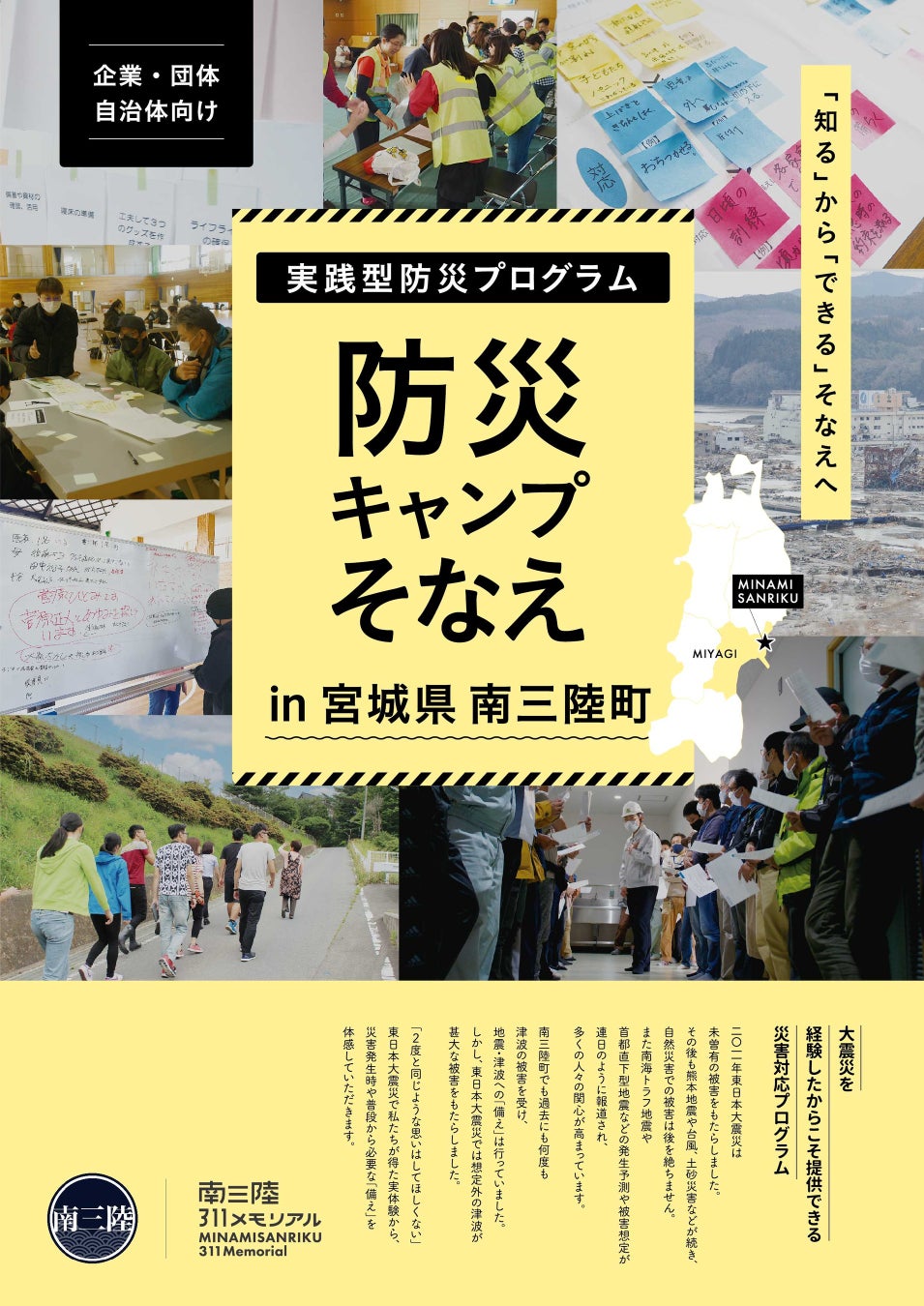 宮城県南三陸町観光協会が2015年から提供している「防災キャンプそなえ」。東日本大震災で実際に避難所となった施設周辺をフィールドに、避難所運営や被災した方の体験をもとにした、実践的な宿泊型防災プログラムです。近年、自然災害が全国各地で頻発しており、自然災害への備えがより重要になっているため、より多くの方に本プログラムを知り、活用していただきたいとの思いから紹介リーフレットを刷新して公開をしました。リーフレットはWEBサイトから無料でダウンロードできるほか、郵送でもお届けしています。
