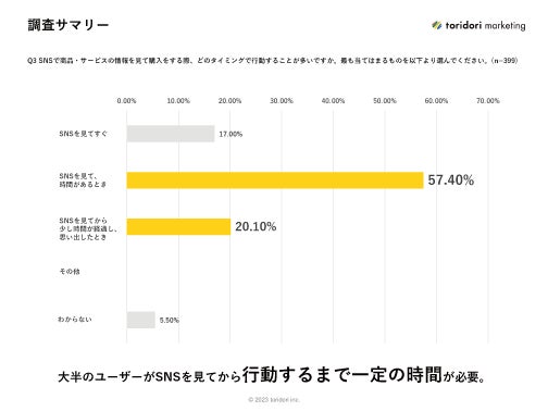 また、購買行動を行うタイミングについての質問では、SNS上での気になる投稿を閲覧した直後ではなく、”時間がある時”や”思い出した時”に購買行動を行うと回答したユーザーが8割近くにのぼりました。