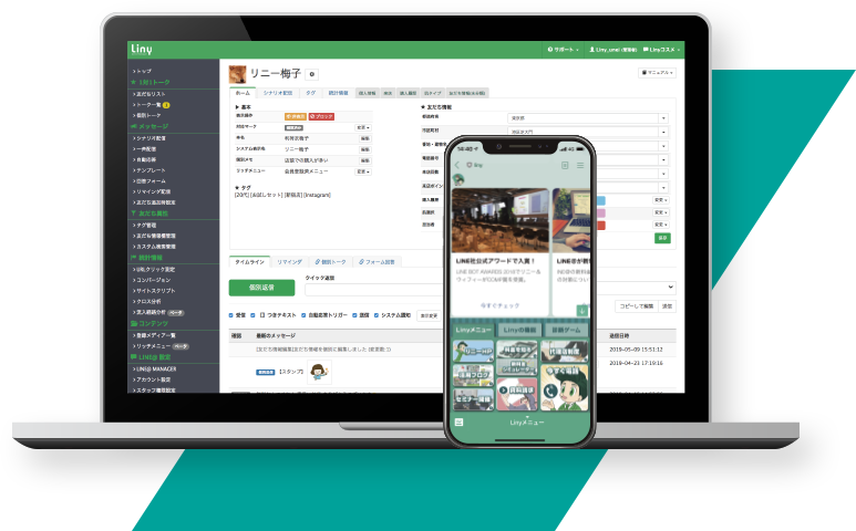 「Liny」はLINE公式アカウントの機能に加えてセグメント 配信・顧客管理・自動応答・流入経路分析などの機能があり、 これらを用いてユーザーの行動、属性、嗜好にあわせて1to1 のマーケティングを展開できます。