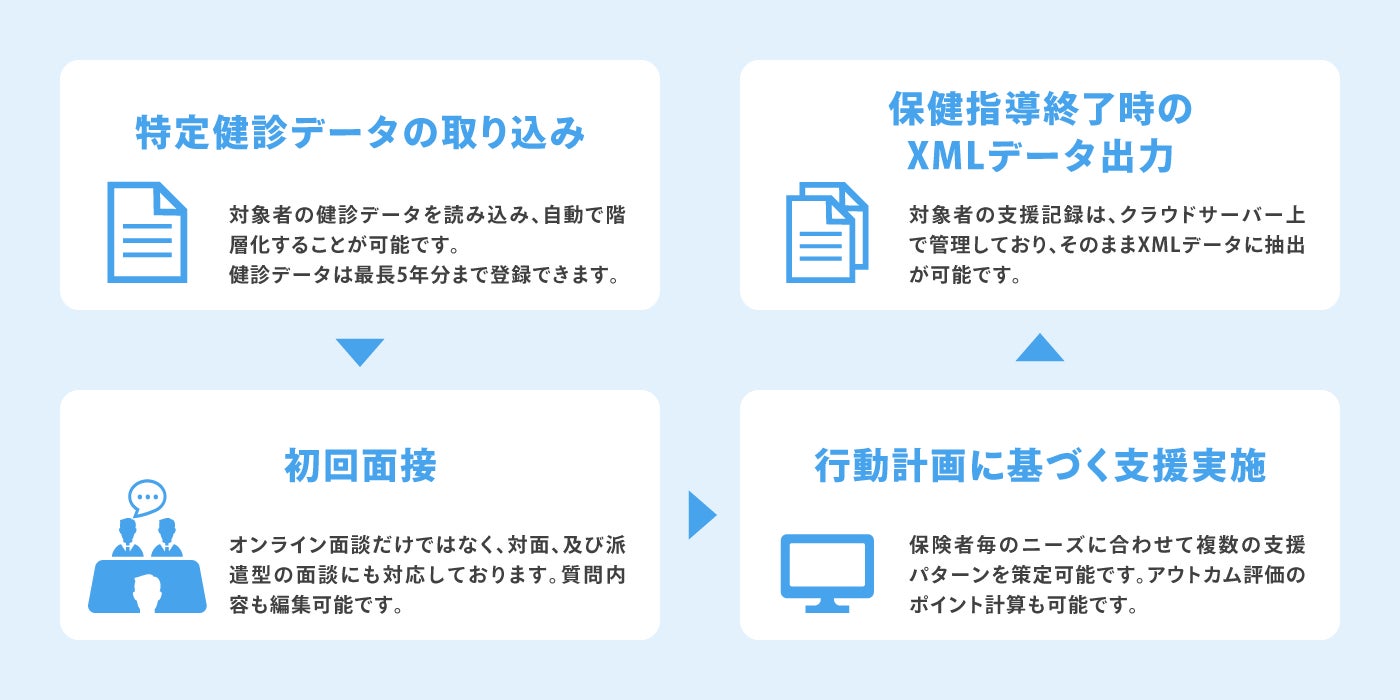 スマウェルは、過去の健診データの取り込み、オンライン/対面の面談の調整から支援の実施、終了時のデータ出力まで、特定保健指導に関する全ての実務をカバーします。