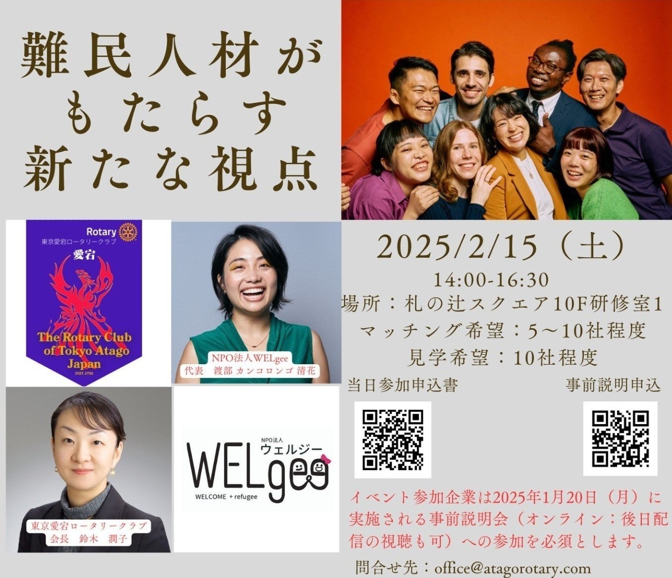 NPO法人WELgee(代表理事:渡部カンコロンゴ清花、以下「WELgee」)は、東京愛宕ロータリー クラブ(会長:鈴木 潤子)ならびにRotary Club of Seattleとの共催のもと、難民人材の可能性に 注目し、日本の企業と難民人材をつなぐマッチングイベントを2025年2月15日(土)に開催します。