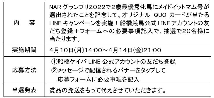 第1回開催は、「マリーンカップ(JpnⅢ)」の開催を記念して、海の幸づくしの5日間!シーフードグルメが味わえるキッチンカーや、千葉県の海産物などが当たるマリーンカップ開催記念抽選会を実施します。また、メイドイットマム号のNARグランプリ2022 2歳最優秀牝馬受賞を記念して、抽選で20名様にメイドイットマム号オリジナルQUOカードが当たるLINEキャンペーンを実施します。盛りだくさんの令和5年度最初の開催をぜひお楽しみください。