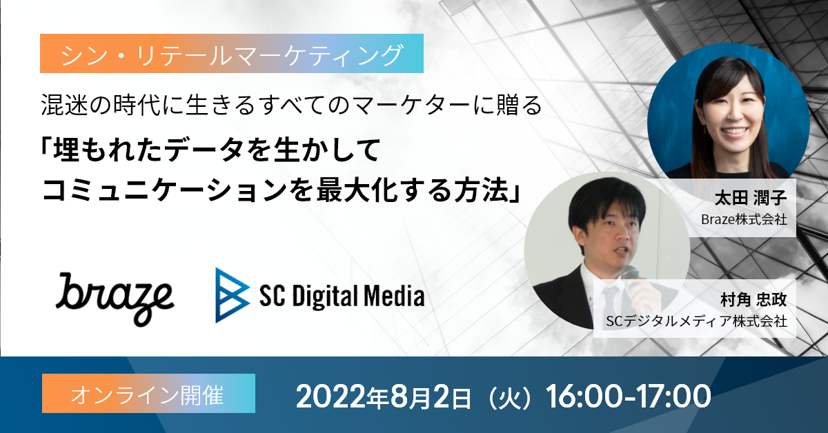 住友商事株式会社の100%子会社、SCデジタルメディア株式会社(東京都渋谷区、代表取締役社長:野﨑健、以下 SCデジタルメディア)は、8月2日(火)16:00より、統合型カスタマーエンゲージメントプラットフォームを提供するBraze株式会社(本社:東京都港区、代表取締役社長:菊地 真之、以下Braze)との共催ウェビナー「シン・リテールマーケティング・混迷の時代に生きるすべてのマーケターに贈る、埋もれたデータを生かしてコミュニケーションを最大化する方法」を開催いたします。
