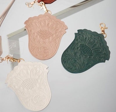 商品詳細:アイコンバッグの「Maestra(マエストラ)」に描かれている花モチーフ型チャーム。裏面にはカードが入るポケット付き。
