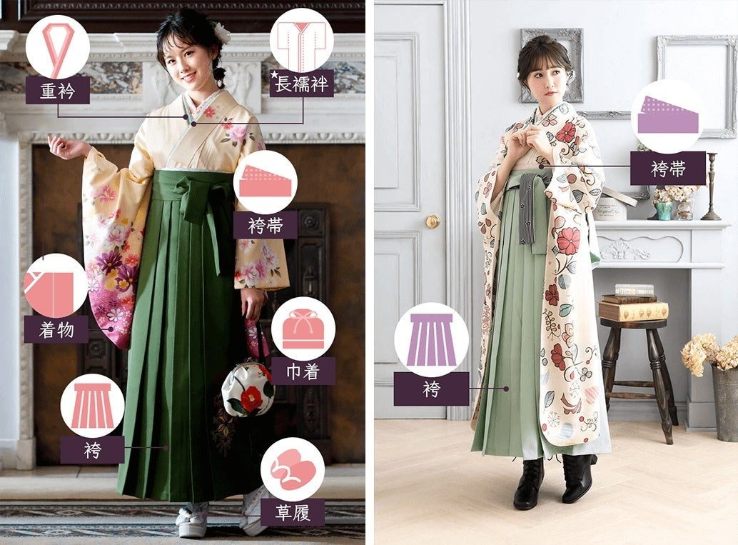 ・着物、袴、重衿、長襦袢、袴帯、巾着、草履、
