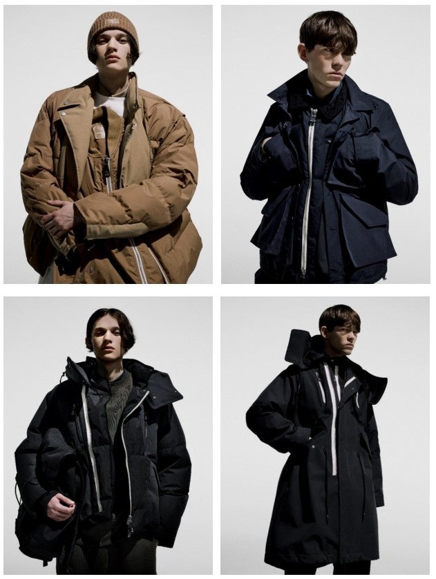 (左上)中綿ライダースジャケット(WINDSTOPPER® PRODUCTS by GORE-TEX LABS)ボクシーなシルエットにアクションプリーツや内ポケットを配し、異素材切替えと巧みなカッティングで機能性とモダンさを両立。¥108,900 (右上)ファティーグジャケット(WINDSTOPPER® PRODUCTS by GORE-TEX LABS)大胆な異素材ポケットと構築的なボクシーシルエットがモダンな機能美を体現。¥59,400 (左下)ダウンジャケット(WINDSTOPPER® PRODUCTS by GORE-TEX LABS)丸みのあるシルエットとシャーリング袖ぐり、実用ポケットを備え、異素材使いと高いカッティング技術が光る一着。143,000円 (右下)フィッシュテールコート(PHENIX独自開発の撥水・防風素材)フレアシルエットに後ろ袖のアクションプリーツ、脱着可能なキルティングライナーとフードを備え、異素材コンビネーションと高いカッティング技術が融合した一着。\176,000