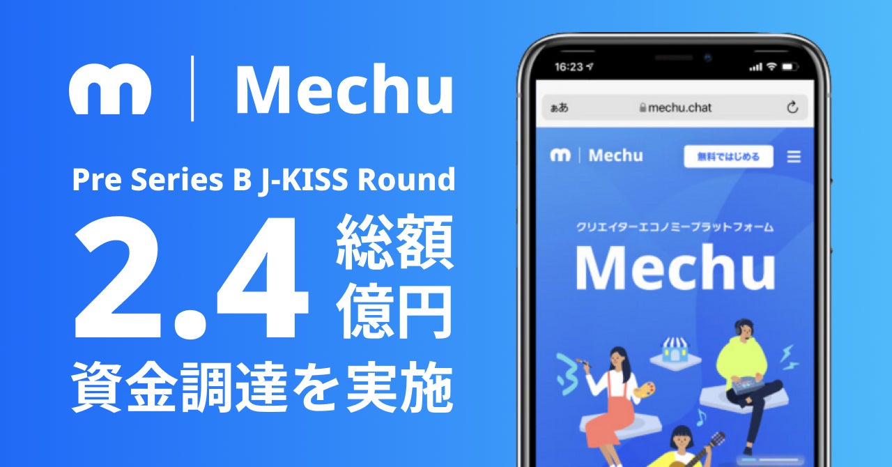クリエイターエコノミープラットフォーム「Mechu」を運営するミーチュー株式会社(本社:福島県郡山市、代表取締役:小泉拓学)は、JR東日本の子会社でベンチャーへの出資や協業を推進するCVCのJR東日本スタートアップ株式会社(本社:東京都港区、代表取締役社長:柴田裕)と資本業務提携することにあわせて個人投資家4名から支援いただき、プレシリーズBラウンドとしておよそ7,000万円の資金調達を実施しました。