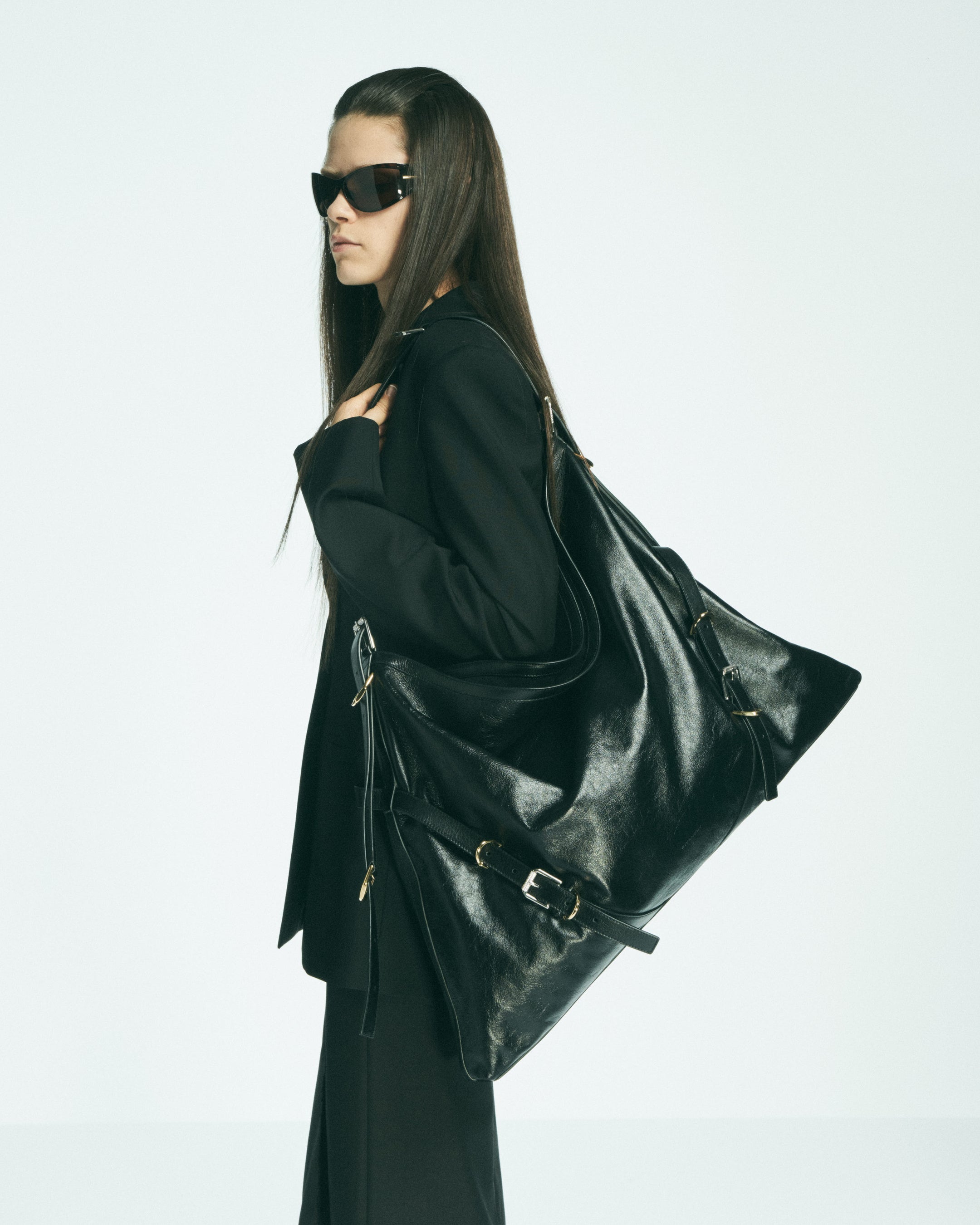メタリックの”GIVENCHY”レタリングが施された調節可能なストラップによって、ロング、ショート、ハンドキャリー、クロスボディなど、さまざまなスタイルに対応します。ジバンシィの特徴的なハードウェア、新しいバックル、スライダー、そしてデザイナーのシグネチャーであるDリングが、ジュエリーのようなクールな魅力を与えています。メゾンの”V”エンブレムをさりげなく再現すると同時に、レザーの光沢と手触りを際立たせ、昼夜問わずどんなスタイルにもパリの”ノンシャラン”な雰囲気を与えます。
