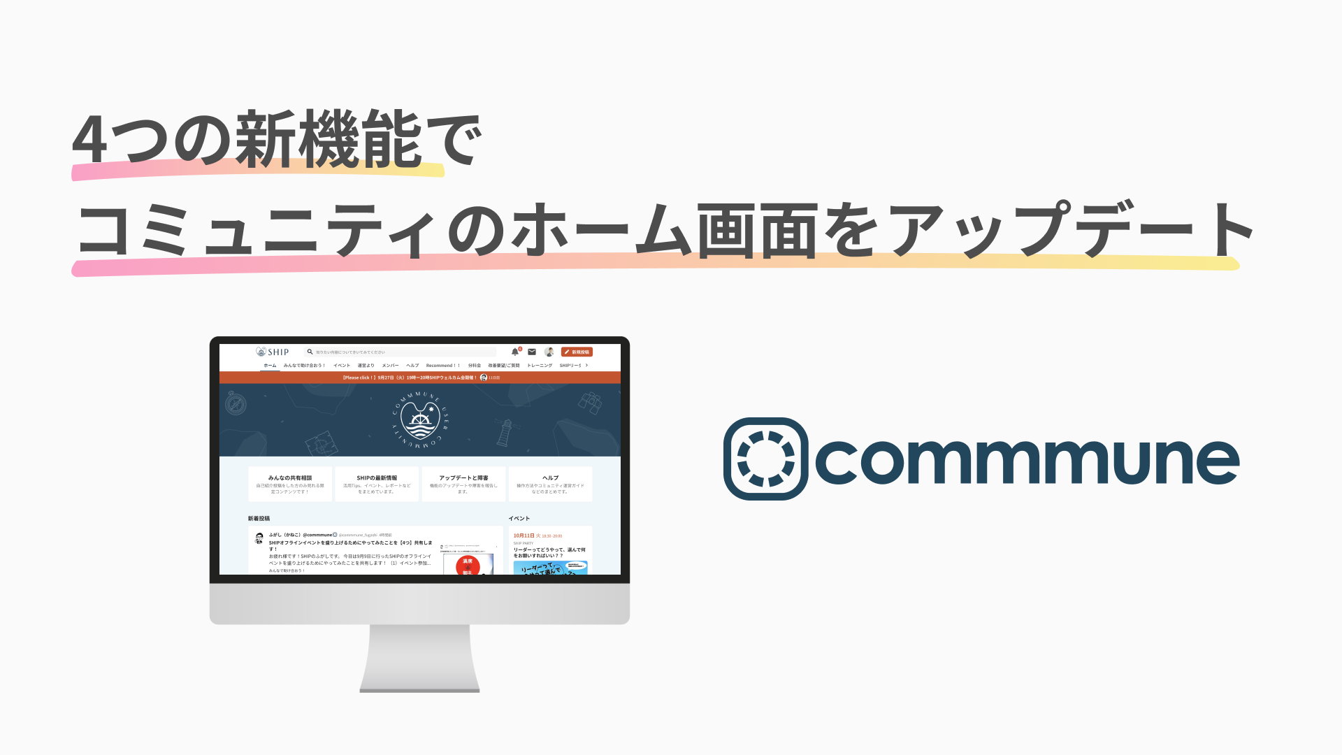 企業とユーザーが融け合うコミュニティサクセスプラットフォーム「commmune(コミューン)」と、効率的なカスタマーサクセスのためのアクション基盤「SuccessHub(サクセスハブ)」を提供するコミューン株式会社(本社:東京都品川区、代表取締役CEO:高田優哉)は、コミュニティサクセスプラットフォーム「commmune」において、4つの新機能を追加し、コミュニティのホーム画面がより見やすく、使いやすくアップデートされたことをお知らせいたします。
