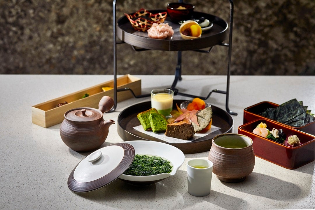 旬の食材を使用し、季節ごとに装いを変えて提供するアフタヌーンティー「茶菓講」を、山本山の高級玉露「上喜撰」2煎と、煎りたての「玉露 雁が音ほうじ茶」3煎とともにお楽しみいただきます。「茶菓講」は10種類のスイーツと、海苔にぎり巻きが3貫ついています。飲み終えた玉露の茶葉はお召し上がりいただけます。