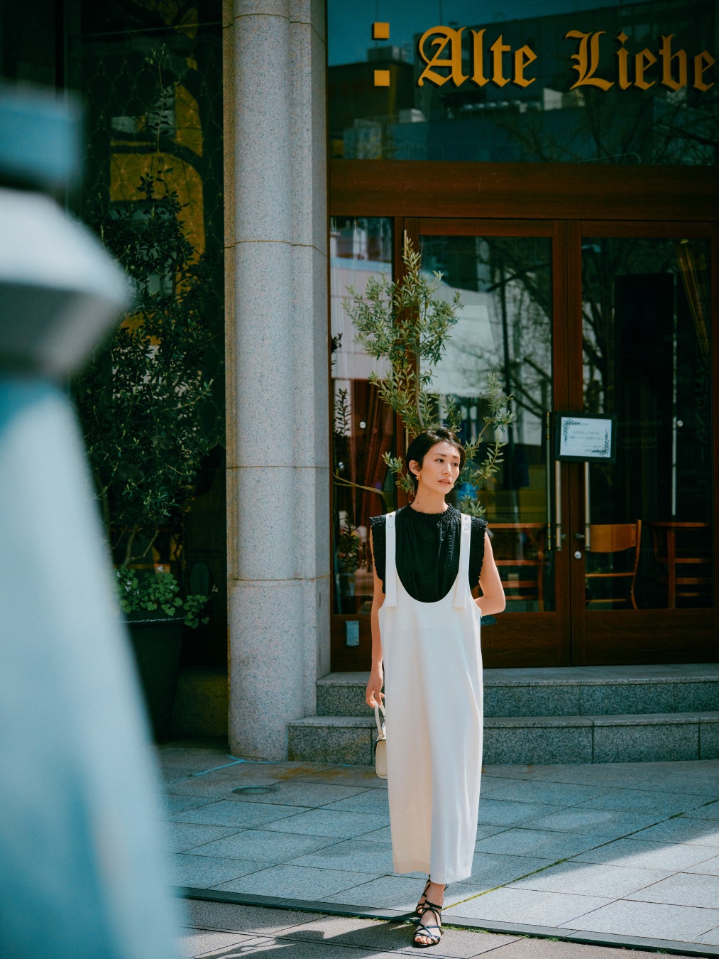 程よいきちんと感とトレンド感を両立させたい、カジュアルなホテルでのランチシーン。Iラインが今っぽい大人仕様のジャンパースカートを、黒のブラウスやヌーディサンダルできれいめに引き締めたモノトーンコーデなら完璧!前後着用可能の2WAY仕様で、インナーに合わせて雰囲気を変えられます。