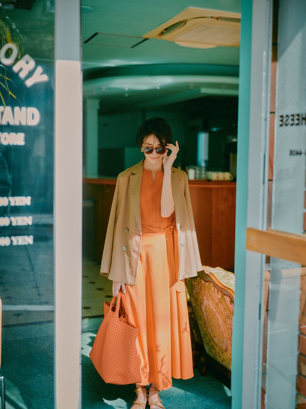 夏のバカンスは、きれい色ワンピースで気分を盛り上げたい。元気なオレンジカラーとシックなラップデザインのバランスが絶妙な一着に、シアージャケットを羽織って今年らしいコーディネートに。ワンピースのリネン風素材は、実はポリエステル。だからシワになりにくく、紫外線遮断機能も付いて真夏に嬉しい!