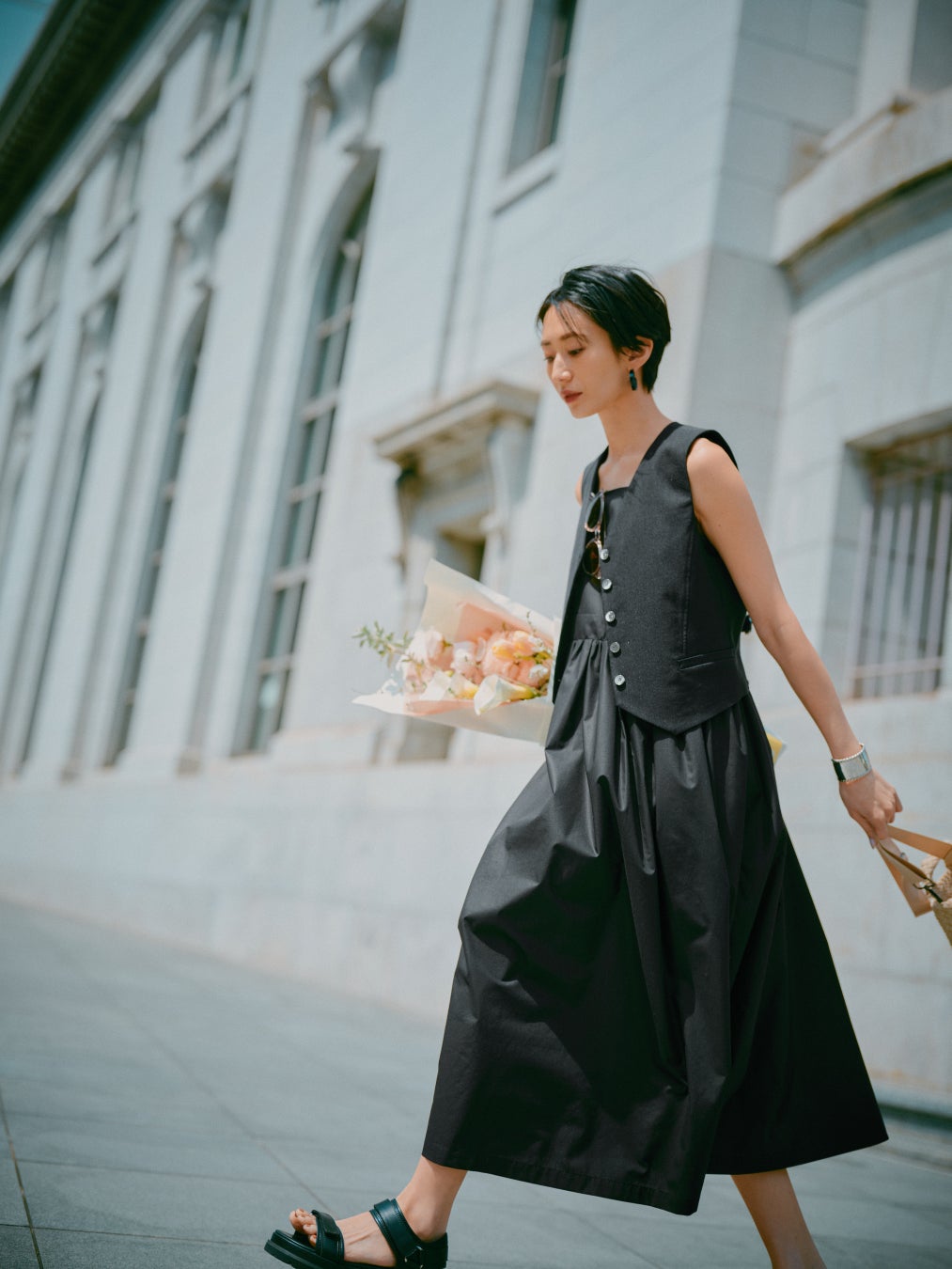華奢な肩紐がついた着心地も軽やかなブラックワンピースは、一枚持っておくと夏のさまざまなシーンで大活躍。Tシャツやタンクトップをレイヤードすれば日常に、こんな風にトレンドのマニッシュなジレを重ねればちょっとしたお呼ばれにも。重めのフラットサンダルを合わせて、モードにドレスアップして。