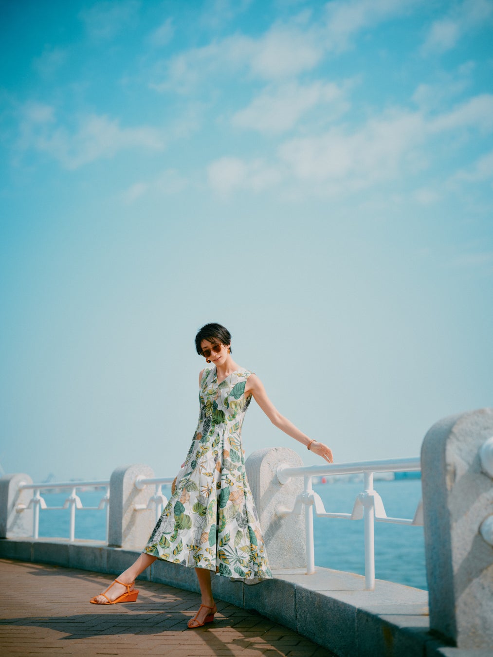 インポートの鮮やかなリーフプリント生地をたっぷり使ったフィットアンドフレアのワンピースは、海辺のショートトリップによく映えるスペシャルな一着です。ラフィアハットやきれい色のサンダルなど、夏らしい小物をプラス。