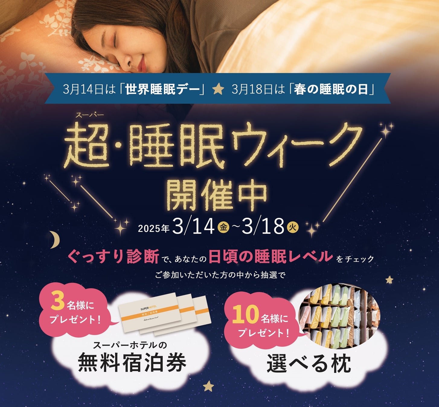 「Natural, Organic, Smart」をコンセプトに国内173店舗のホテル運営を手掛ける株式会社スーパーホテル(所在地:大阪府大阪市、代表取締役社長:山本健策)は、2025年3月14日(金)の「世界睡眠デー」から3月18日(火)の「春の睡眠の日」までの5日間、睡眠の質を見つめ直し「ぐっすり」眠っていただくことを追求した「超(スーパー)・睡眠ウィーク」を、全国のスーパーホテル店舗とX上で実施します。