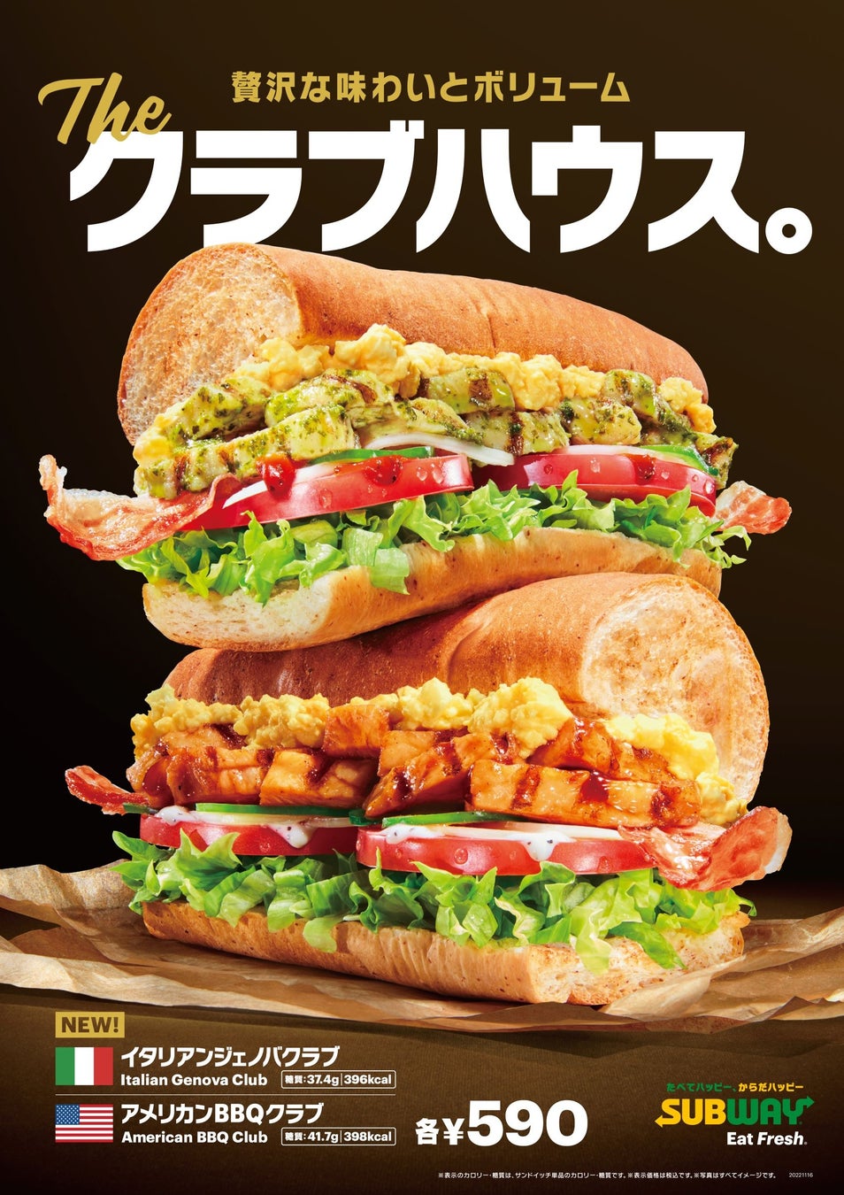 日本サブウェイ合同会社(本社:東京都品川区)が展開する サンドイッチ・チェーン『サブウェイ』は、2022年11月16日(水)から全国のサブウェイで『イタリアンジェノバクラブ』『アメリカンBBQクラブ』を発売します。