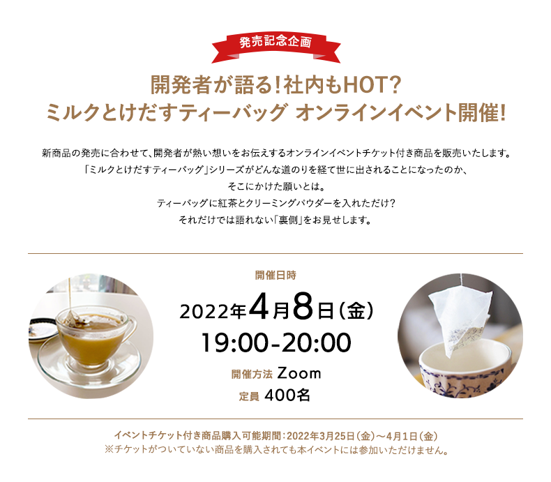 そんなミルクとけだすティーバッグの開発に心血を注いできた開発者がこれまでの道のり、開発秘話、これからの日東紅茶をお話しするオンラインイベントです。