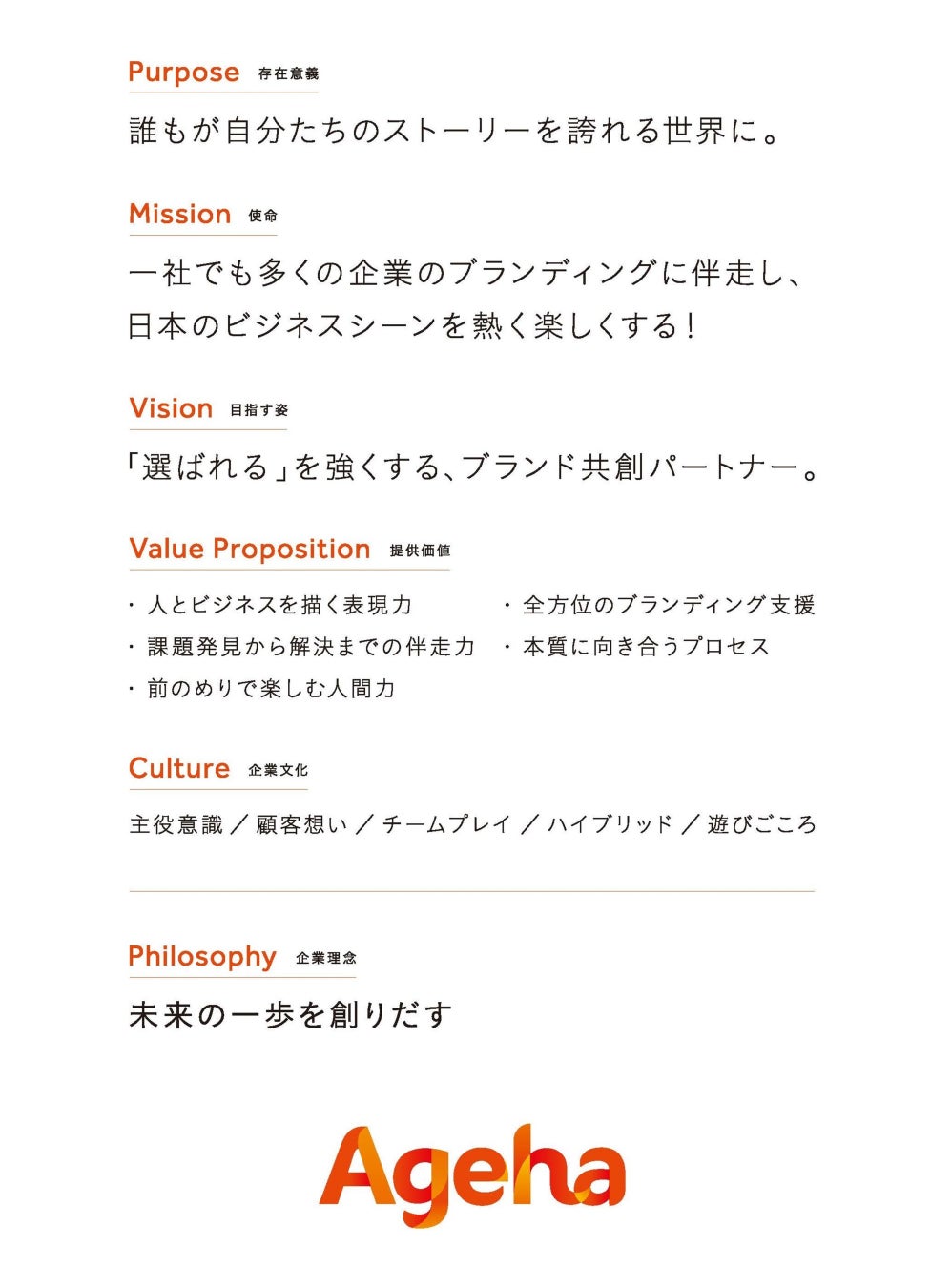 私たちのコアバリューである、人や組織の魅力を発見し、正しく・ポジティブに伝えることで、世の中を元気にしていくことを、明るいオレンジのカラーで表現。さらに、ほんのりつながった「Ageha」の文字は、課題の発見から解決まで、ワンストップでお客さまと伴走する姿を示し、柔らかな曲線とシャープな直線を組み合わせたシルエットで、温かさと遊びごころを大切にする、私たちの想いが込められています。