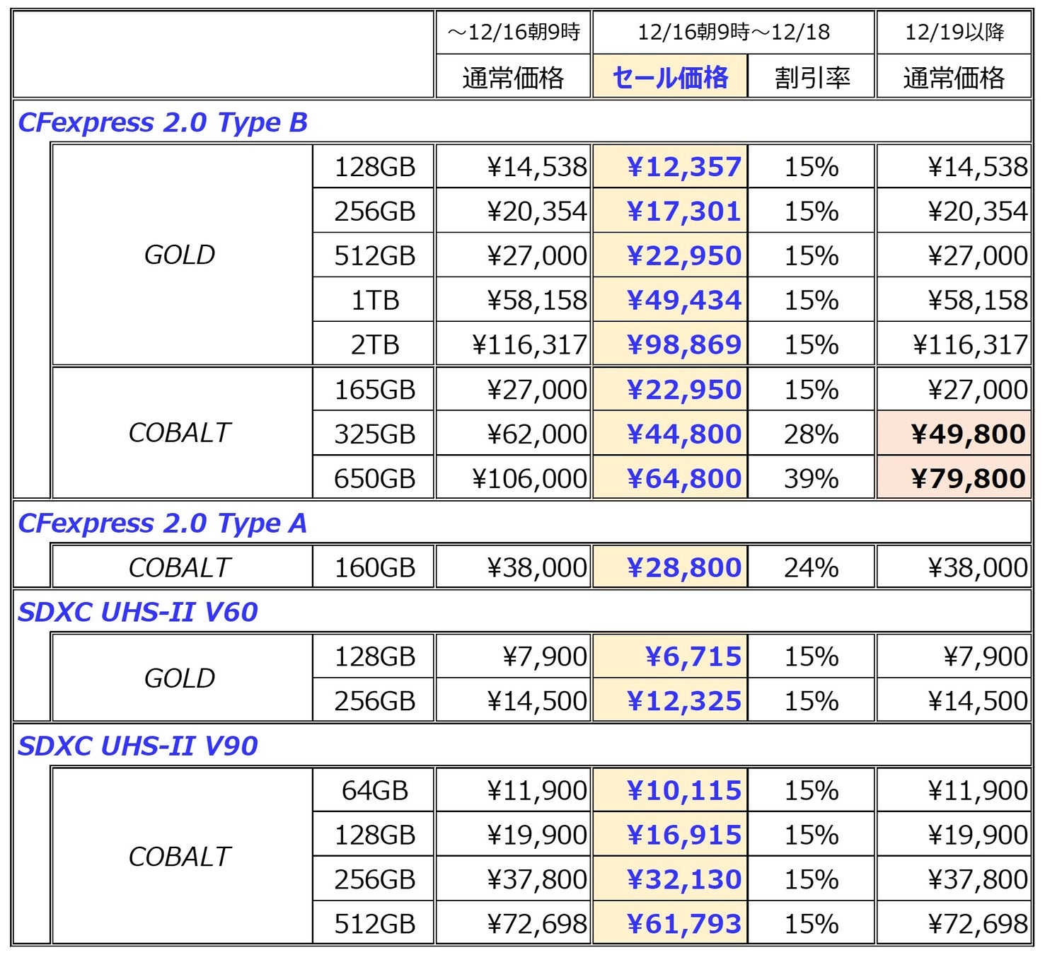 CFexpress Type B COBALT 325GB/650GBカードは、セール後12月19日に通常価格を値下げします。