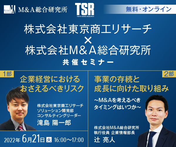 【セミナー】M&A総合研究所、東京商工リサーチとの共催セミナー「企業経営を取り巻くリスクにどう向き合うか~M&Aによる事業の存続と成長に向けた取り組み~」を2022年6月21日(火)に開催