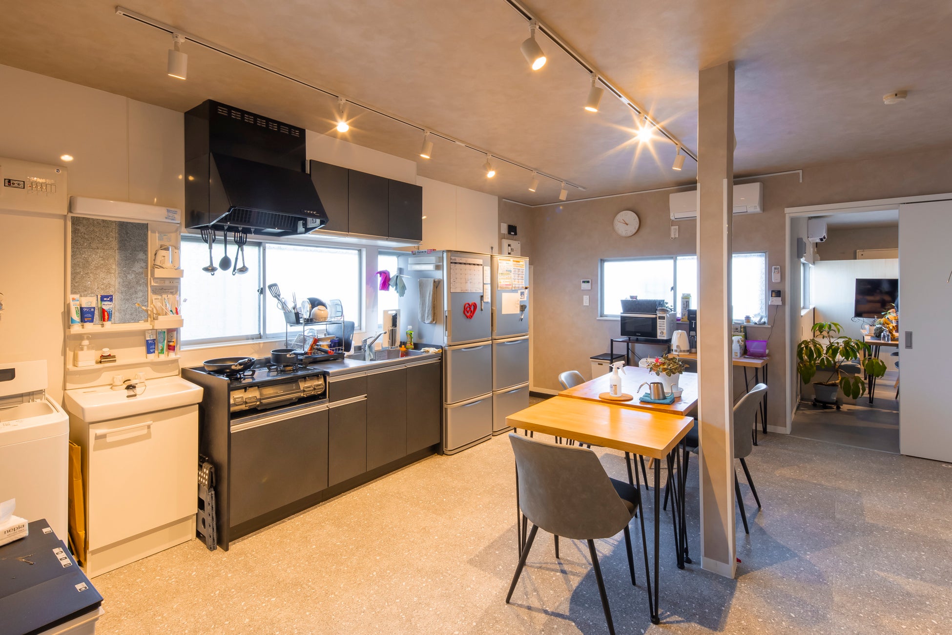 物件の再生にあたって、2Fの居住部分では、風呂なし和式トイレだった水回り部分を一新し、全8部屋のシェアハウスとしてリノベーションを実施しました。共有エリアでは、居住者同士の交流やクリエイティブの相互共有を促す「アトリエコリビング」をつくるなど、従来アパートだった部分を活用しながら、シェアハウスとして再生しました。