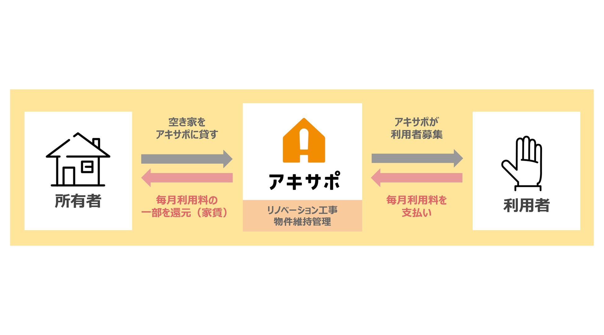 空き家を「アキサポ」が借り受け、「アキサポ」全額費用負担でリノベーション工事を行い、一定期間転貸するサービスです。地域にマッチした空き家活用を提案することで街の資源である空き家の再生を通じて地域コミュニティの活性化に貢献しております。