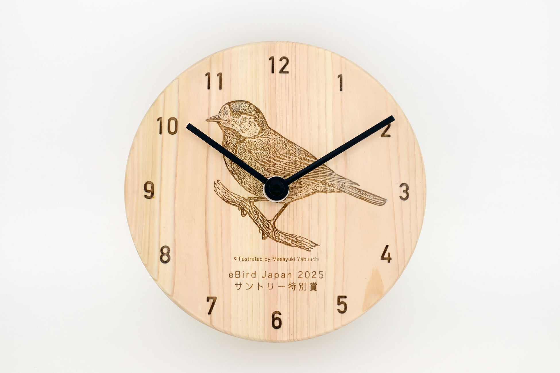 期間中にヤマガラの仲間(ヤマガラ、オーストンヤマガラ、オリイヤマガラ)を含むチェックリストを3件以上投稿された方10人(該当者多数の場合は抽選)に、サントリーホールディングス株式会社提供の「育林材のオリジナル時計(ヤマガラのデザイン)」をさしあげます。