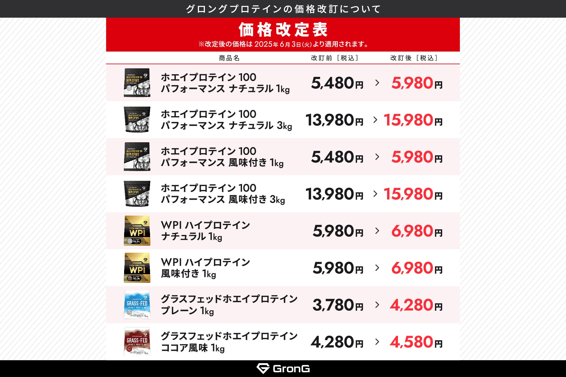 サプリメントやトレーニング器具の販売などをおこなう株式会社Ultimate Life(本社:大阪市東成区、代表取締役社長:田中 悠貴)は、2025年6月3日(火)に、GronG(グロング)ブランドの一部ホエイプロテイン商品の価格を、以下の通り改定します。