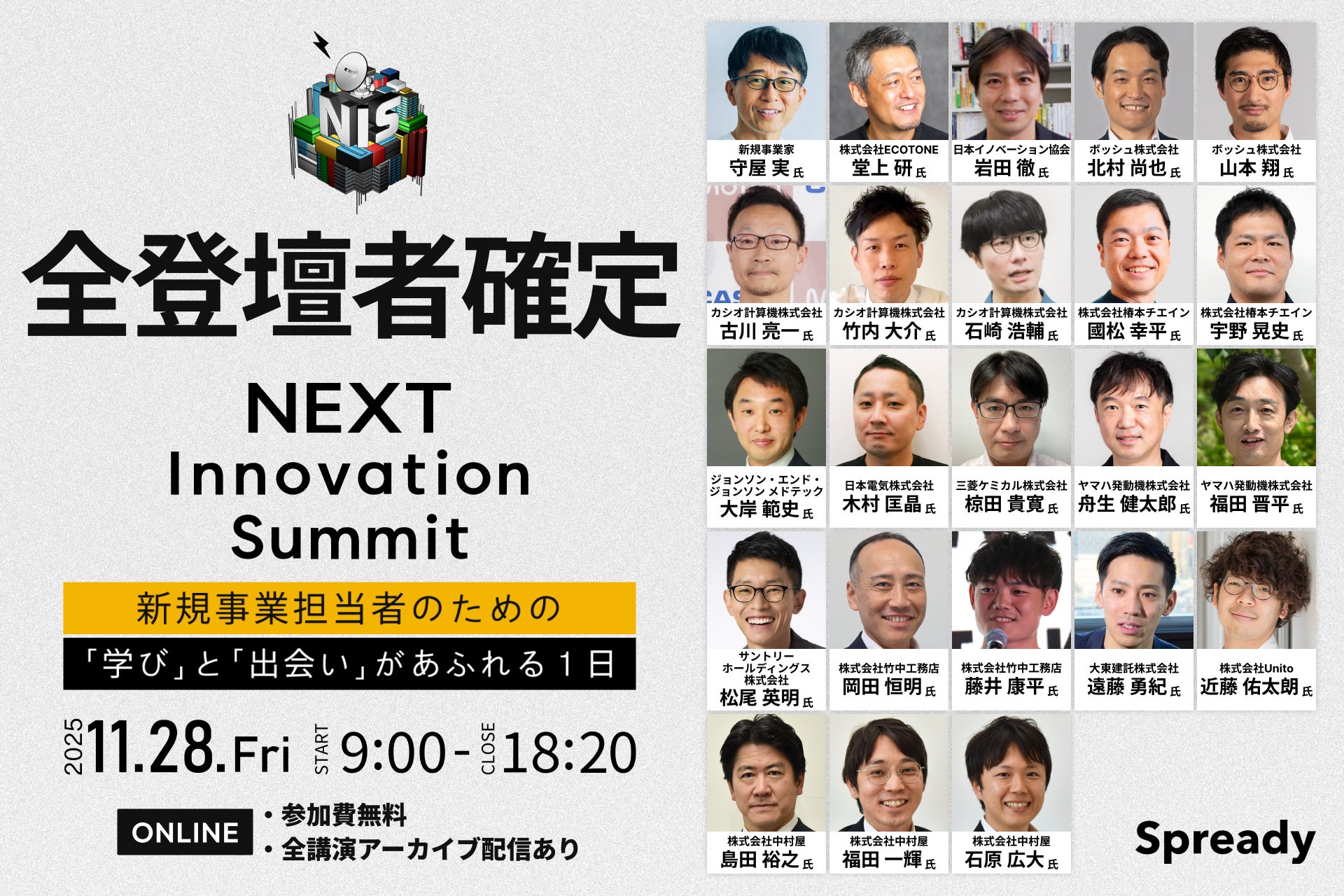 新規事業支援サービスを提供するSpready株式会社(本社:東京都渋谷区、代表取締役社長:佐古雅亮、以下「当社」)は、2025年11月28日(金)に新規事業の取り組みや知見を発信するカンファレンス「NEXT Innovation Summit 2025 in Winter 新規事業担当者のための『学び』と『出会い』があふれる1日(以下「本イベント」)」の全登壇者が確定したことをお知らせします。