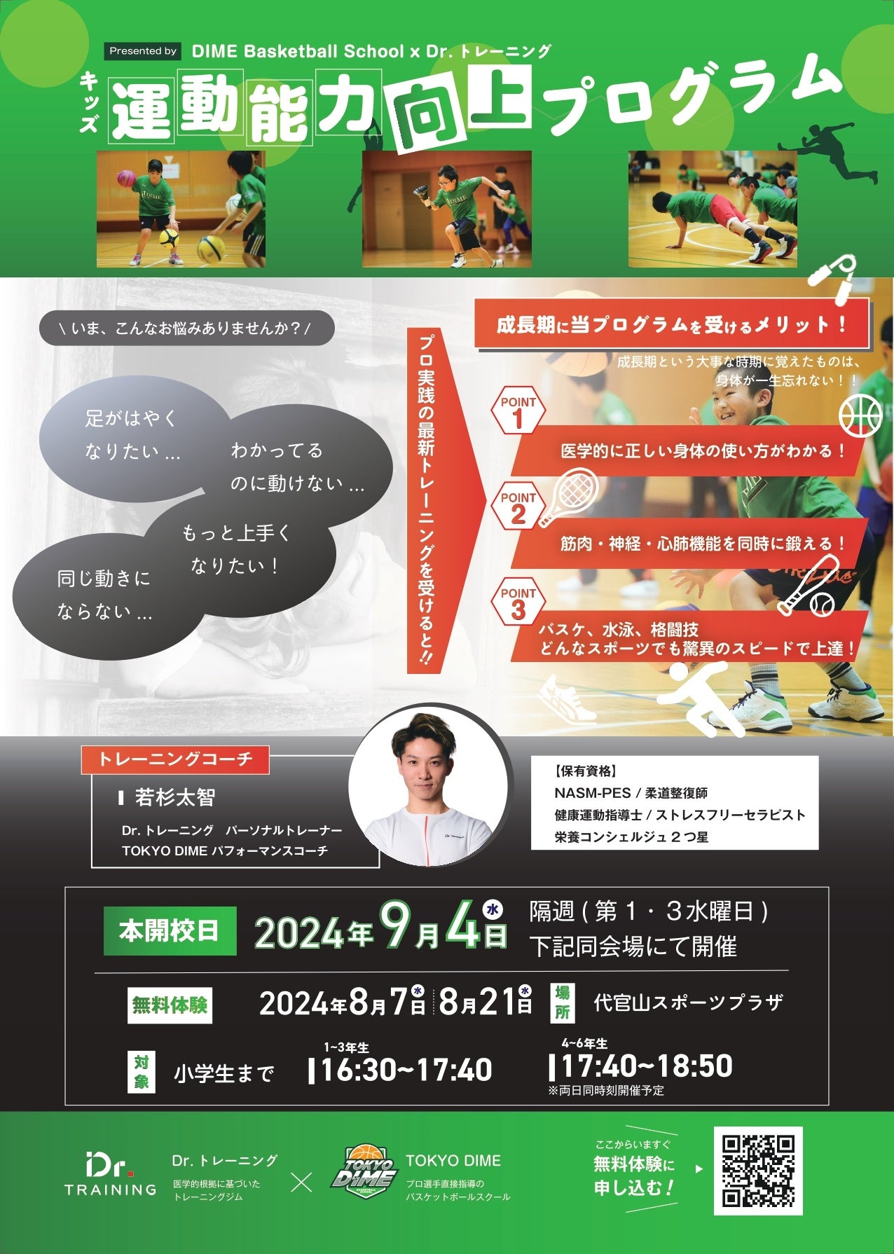 9月4日(水)より、3人制プロバスケットボールチームのTOKYO DIMEが運営する「DIME Basketball School」は、パーソナルトレーニング事業を展開するDr.トレーニングと共同で、子ども向けの「運動能力向上プログラム」を代官山スポーツプラザにて開校します。開校にともない、無料体験会も実施します。