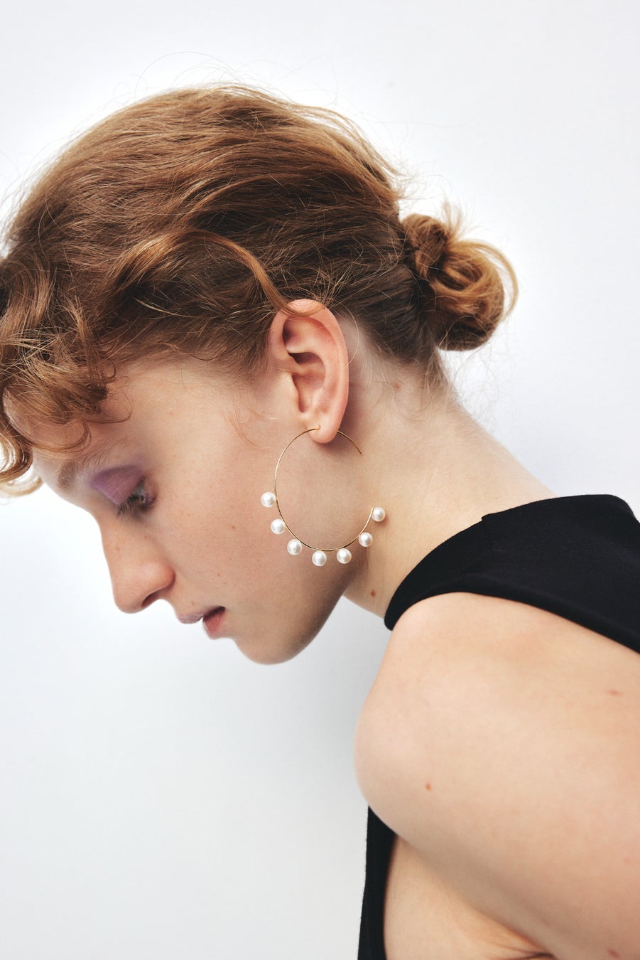 流麗なフープラインに淡水パールが浮かぶ、気品とエッジが交差するピアス。