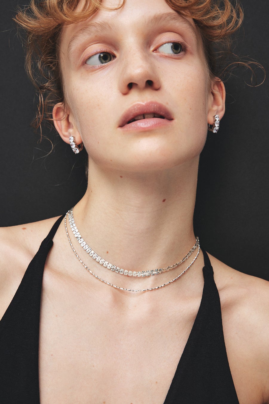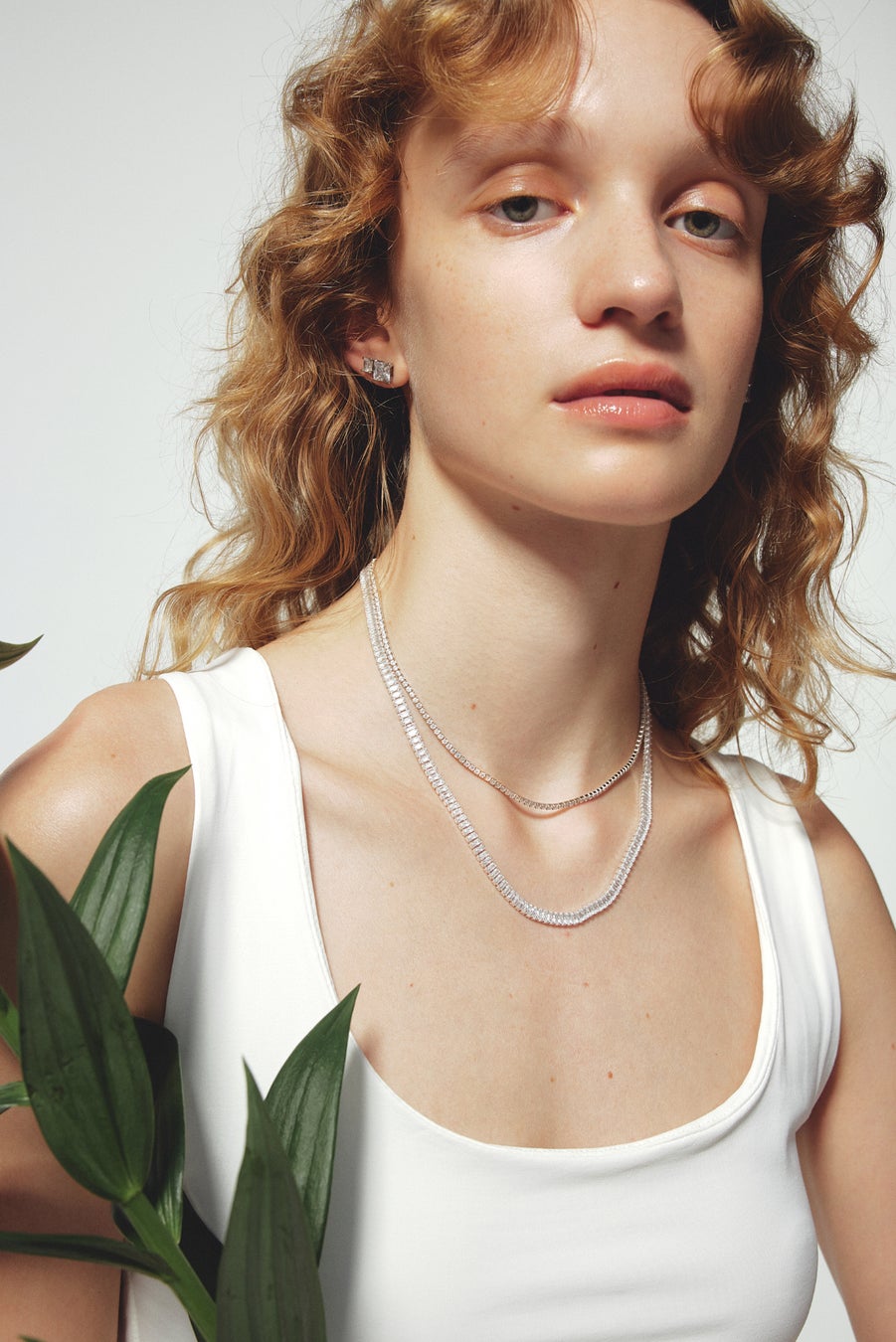 一定のリズムで光を刻み、デコルテに洗練をもたらすネックレス。