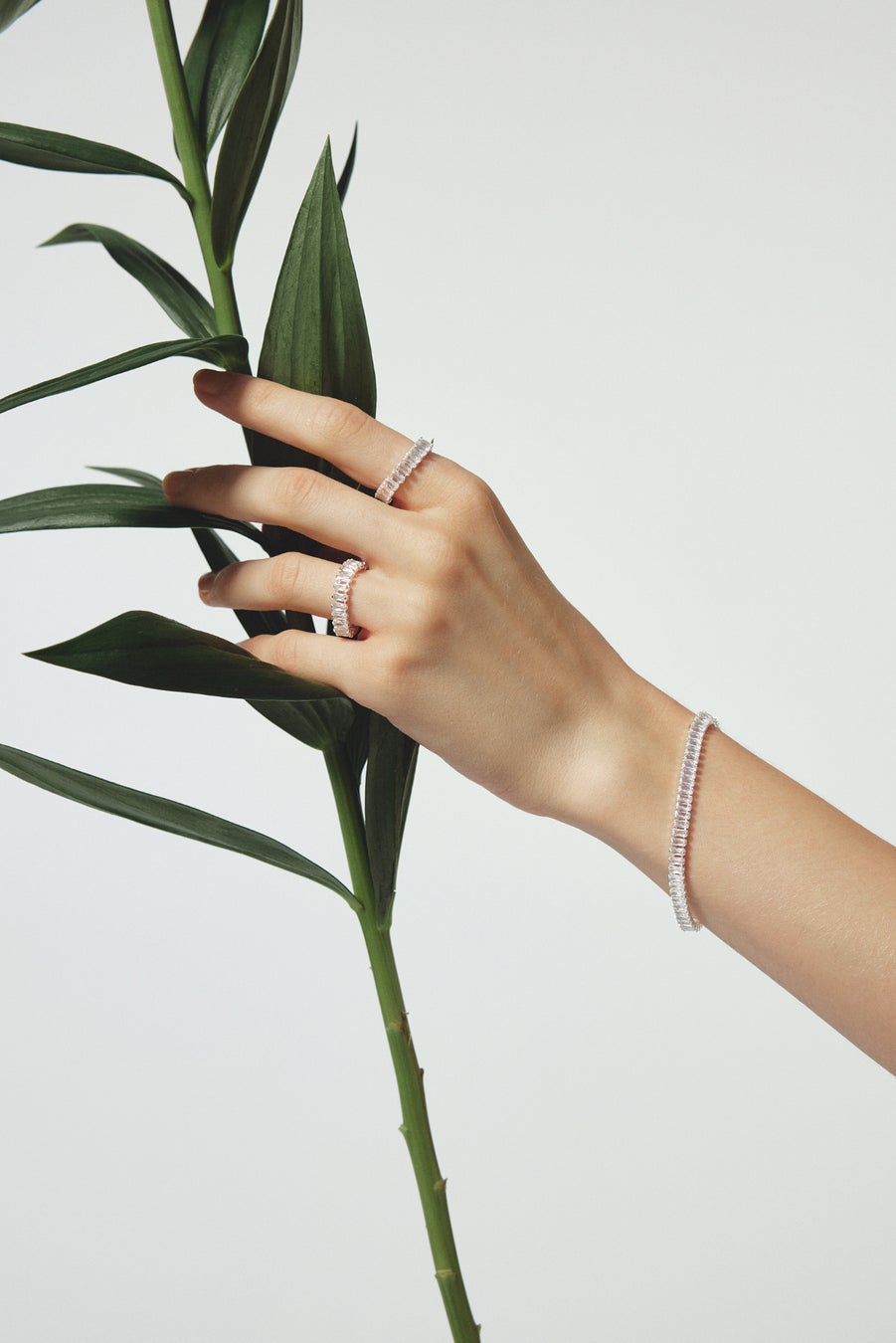 連なるスクエアカットのストーンが、端正でストイックなムードを静かに主張。