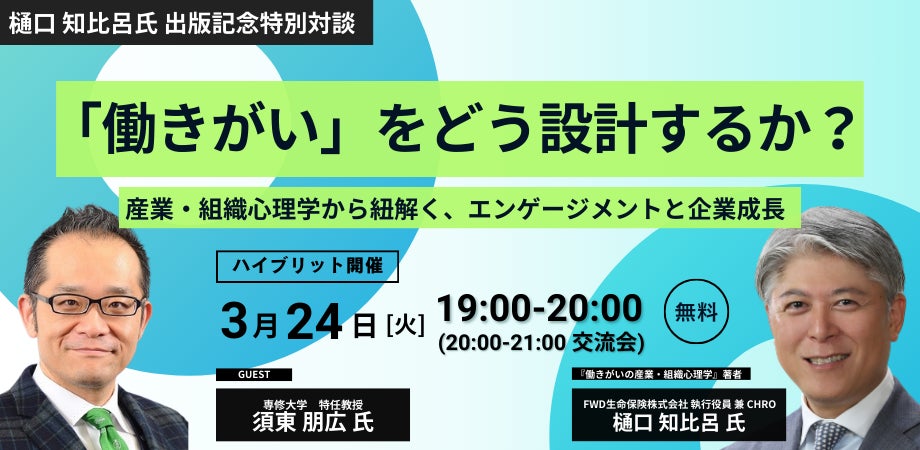 本セミナーでは、2025年12月に『働きがいの産業・組織心理学』を上梓された樋口 知比呂氏をお招きし、第一部では書籍の内容を軸に、科学的な視点から「働きがい」のメカニズムを解説いただきます。