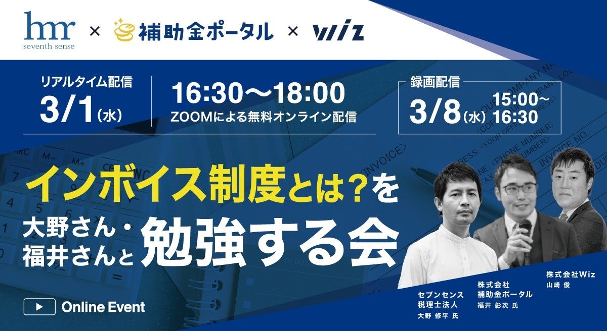 3⽉1⽇(⽔)、3⽉8⽇(⽔)※、株式会社補助⾦ポータル(本社:東京都渋谷区、代表取締役:福井彰次)は株式会社Wiz 山崎氏と、セブンセンス税理⼠法⼈ 公認会計⼠・税理⼠の⼤野⽒をゲストに迎え、「《インボイス制度とは?》を⼤野さんと福井さんと勉強する会」を開催いたします。