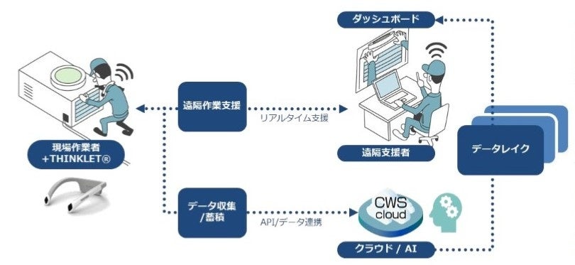 当社が提案する遠隔支援システムでは、首掛け型ウェアラブルデバイス『THINKLET(シンクレット)』を核として、高圧ガス保安協会事務所や事業所における施設・設備、帳簿類等の情報を遠隔から効率的に取得することができます。